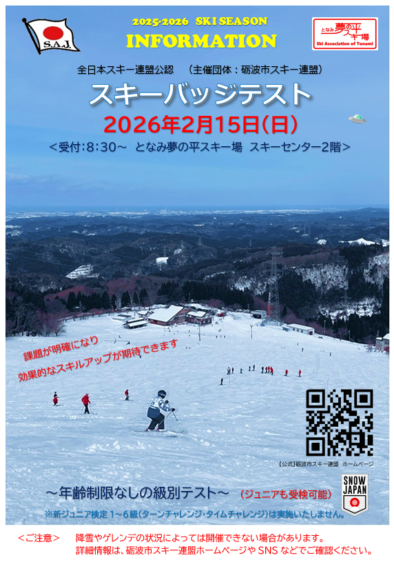 SAJ公認 「スキーバッジテスト」開催のお知らせ