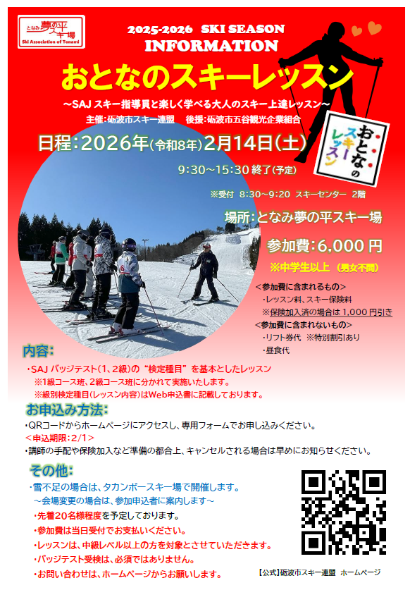 「2026おとなのスキーレッスン」開催のご案内 2026-02-08 最終更新日時 : 2026-02-08 skitonami 参加申込フォーム 参加を希望される方は、参加申込フォームにアクセスしてください。 ※ご質問は、ホームページ内の「お問い合わせ」からお願いします。 雪不足の場合はタカンボースキー場での開催となりますので、参加申込者の方へ案内いたします。